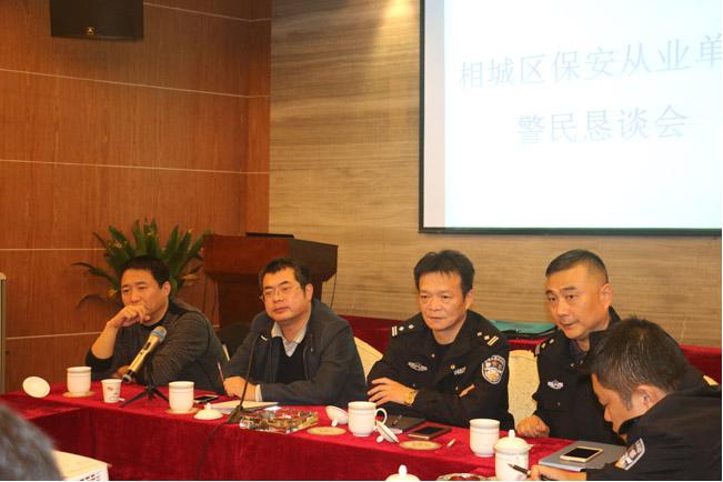 2015年11月19日14:30在江蘇康平保安公司會議室舉行:相城區(qū)保安從業(yè)單位警民懇談會,與會的有市公安局治安支隊保安監(jiān)管大隊的朱大、戴大,公安相城分局治安大隊的楊大、賀大、吳警官,還有相城區(qū)各保安行業(yè)的企業(yè),通過懇談會,深刻領(lǐng)悟市局、分局領(lǐng)導(dǎo)有關(guān)指示精神!今年10月—12月省公安廳開展保安市場專項整治活動,公司積極做好:治安信息員、法制宣傳員、義務(wù)巡邏隊員工作,爭取完成省公安廳要求2016年6月底前所有在崗保安員必須持證上崗的指示,向兄弟單位學(xué)習(xí),不斷完善服務(wù)質(zhì)量,提高公司核心競爭力,走品牌化道路的戰(zhàn)略目標(biāo)前行!